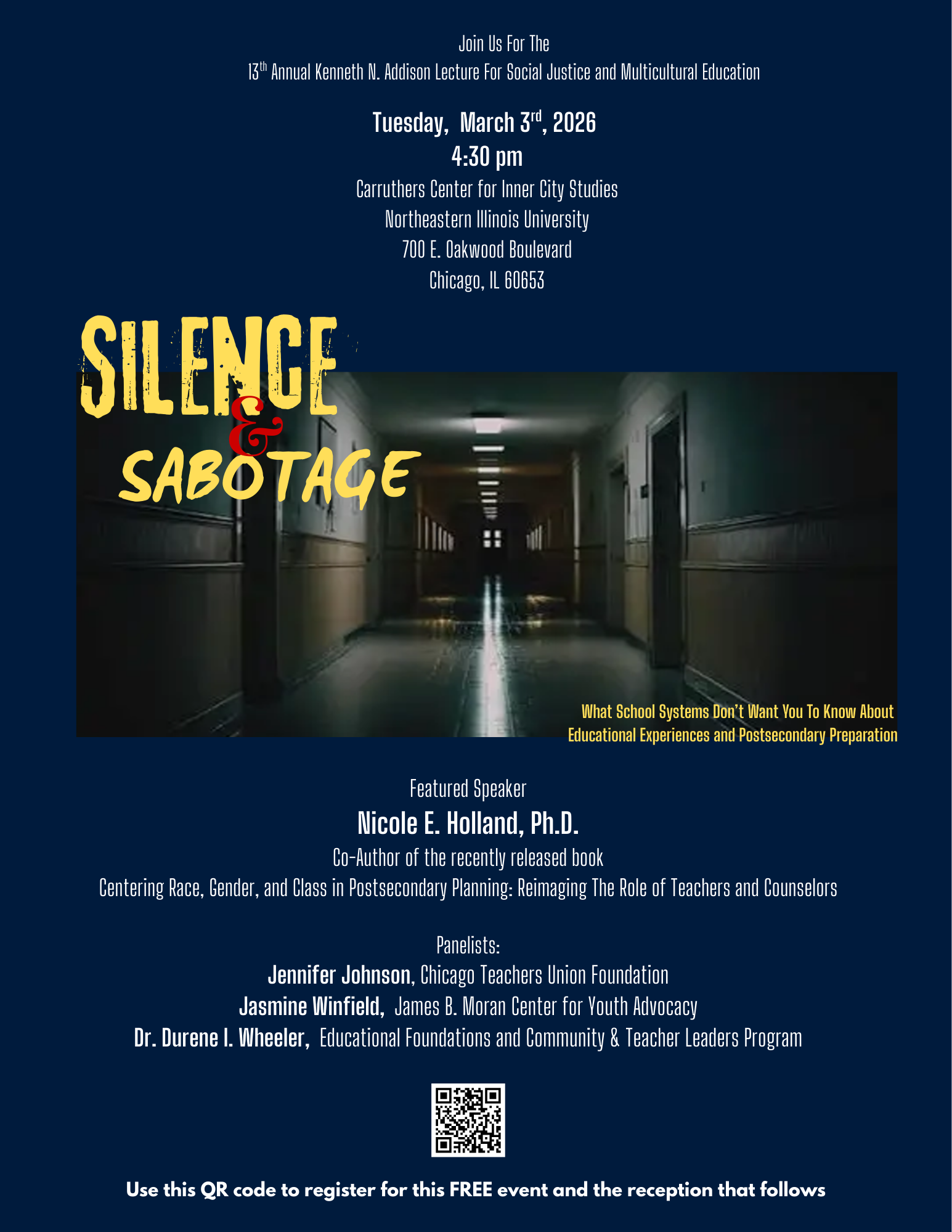 This year's program, Silence and Sabotage: What School Systems Don't Want You to Know About Educational Experiences and Postsecondary Preparation, will feature our very own Dr. Nicole E. Holland who will discuss her new book, Centering Race, Gender, and Class in Postsecondary Planning:
